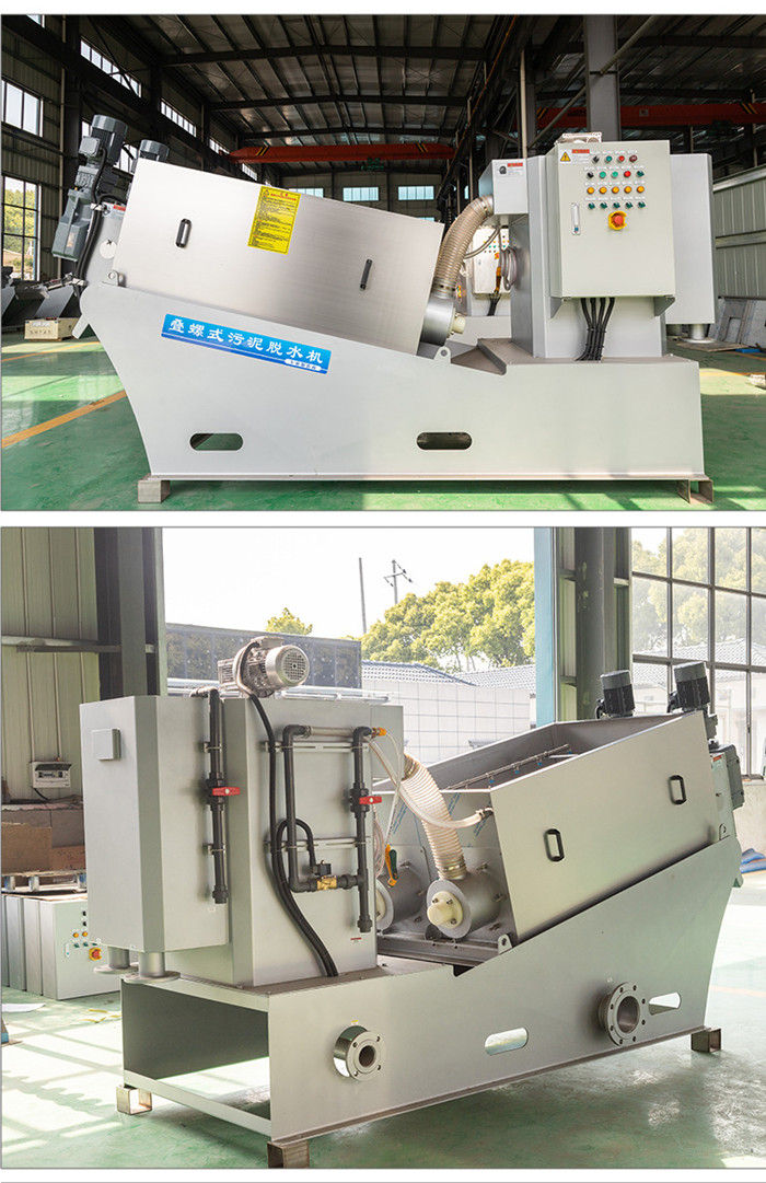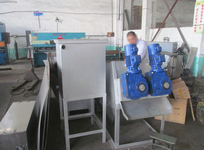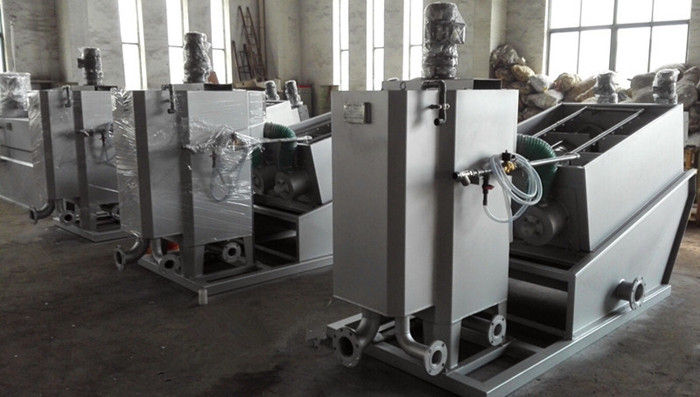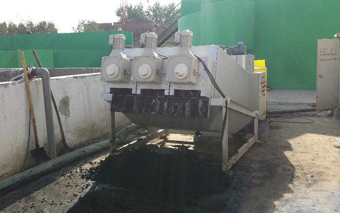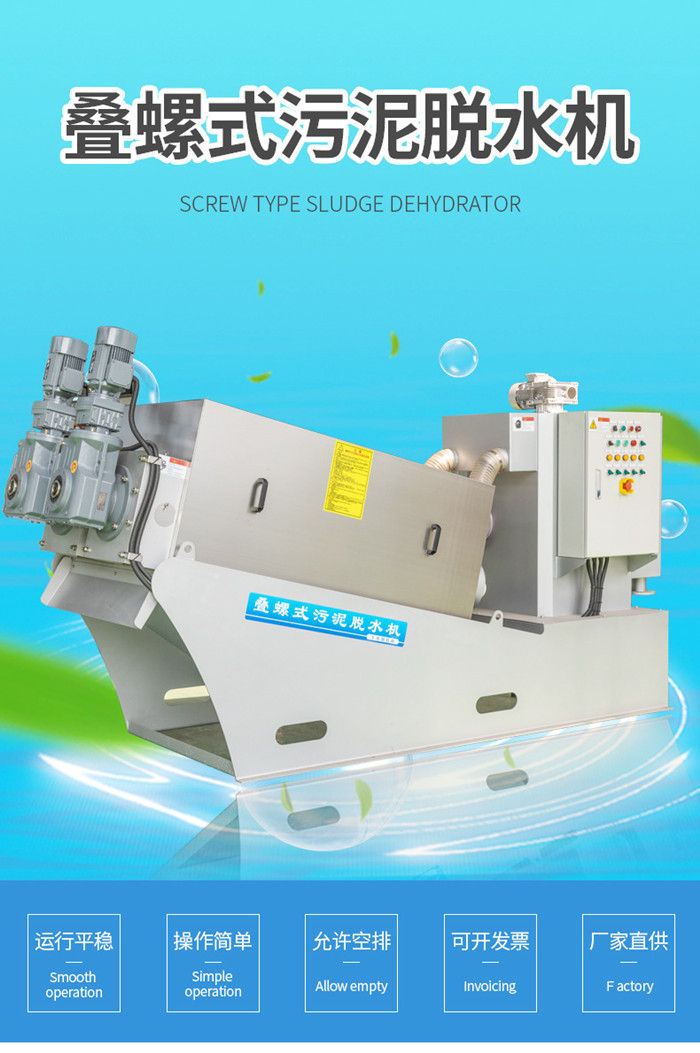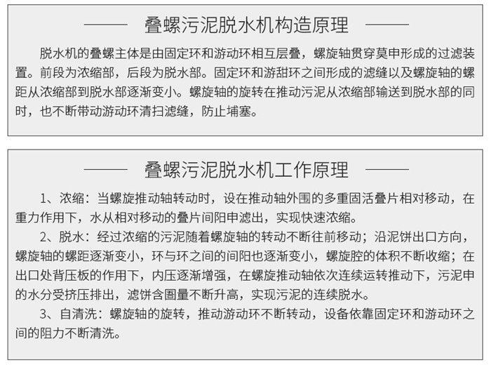 污泥通過泵,輸送至污泥槽,流至混合槽內(nèi),同時(shí)絮凝劑由加藥泵送至槽內(nèi),混合槽由液位控制,防止?jié)M溢。攪拌混合形成泛花,理想泛花象棉花狀,一朵朵的,然后流至過濾機(jī),液體透過動片與定片的間隙流出,固體通過螺旋旋轉(zhuǎn)不斷向前,在出口壓板的作用下充分脫水,至出口。